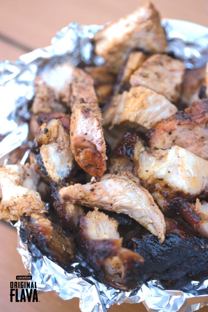 Move the Pork to the sides of the grill and brush the rest of the Jerk sauce on the top then close the lid and cook for further 10 minutes.  (Cook longer if needed)