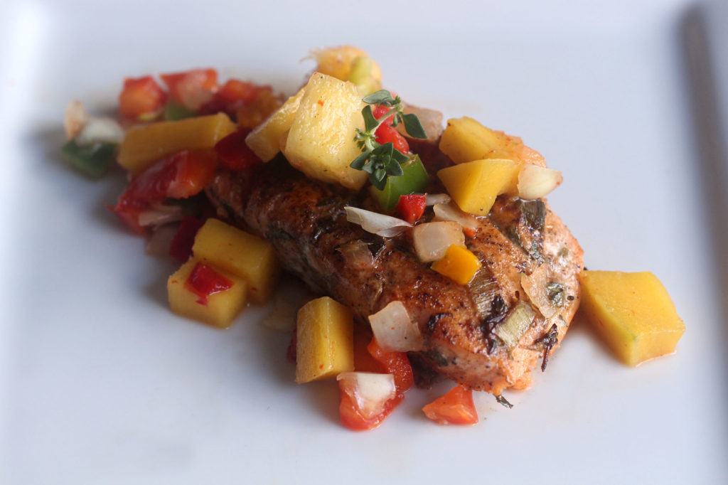 Jerk Salmon with Mango salsa. This dish is a modern day dish with a twist. Perfect for fish lovers and people who love to eat healthy. The Jerked salmon and the mango salsa is the perfect contrast in flavours- The spice of the salmon cooled down the sweet mango salsa combines to compliment each other beautifully! This is a perfect meal to make for romantic dinners! So pick someone special and create this dish for them.