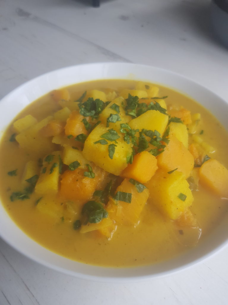 9. After the Pumpkin and yam have softened add some coriander or parsley and simmer for 5 minutes.