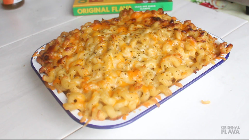 Then sprinkle some cheese crackers on top of the mac and cheese then back for 25 minutes until golden brown and crispy on topp.