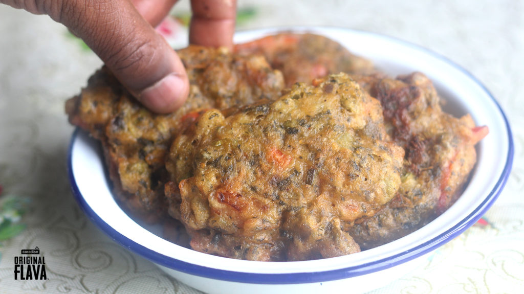 5. In a separate bowl civ 400g flour, and add 1 tsp. baking powder, all purpose seasoning, paprika, garlic, and callaloo mix along with water and mix together until you get a sloppy consistency.