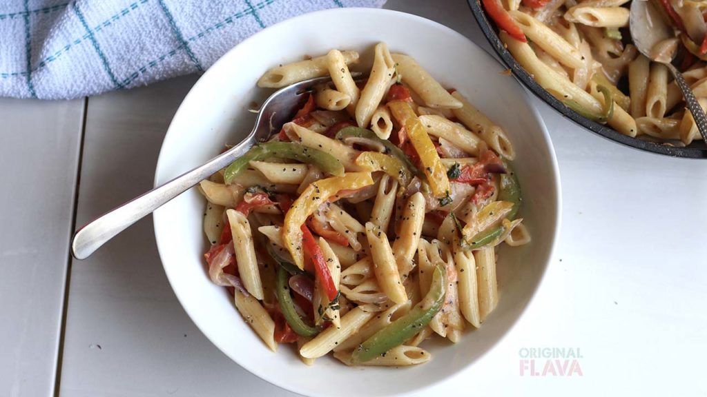 you will need a large frying pan, with some vegetable oil on a medium heat. Then add your onions, spring onions, garlic cloves, and scotch bonnet pepper then cook down until vegetables are soft. Then add a bunch of fresh thyme, tomatoes and bell peppers then mix all the vegetables. Now add some coconut milk and vegan cheese then mix di ting! Season with salt, black pepper and all spice and give di ting ah mix! Add in cooked pasta, then mix together and serve. Serves 4 people.