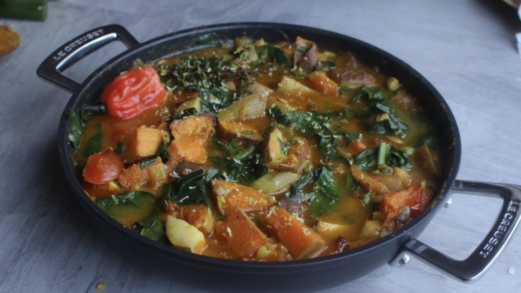 Now take the roasted vegetable out of the oven, and add to the frying pan, then mix together, add some vegetable stock, fresh thyme, Callaloo/ spinach, and scotch bonnet pepper, then cook down until ready. garnish with lime zest